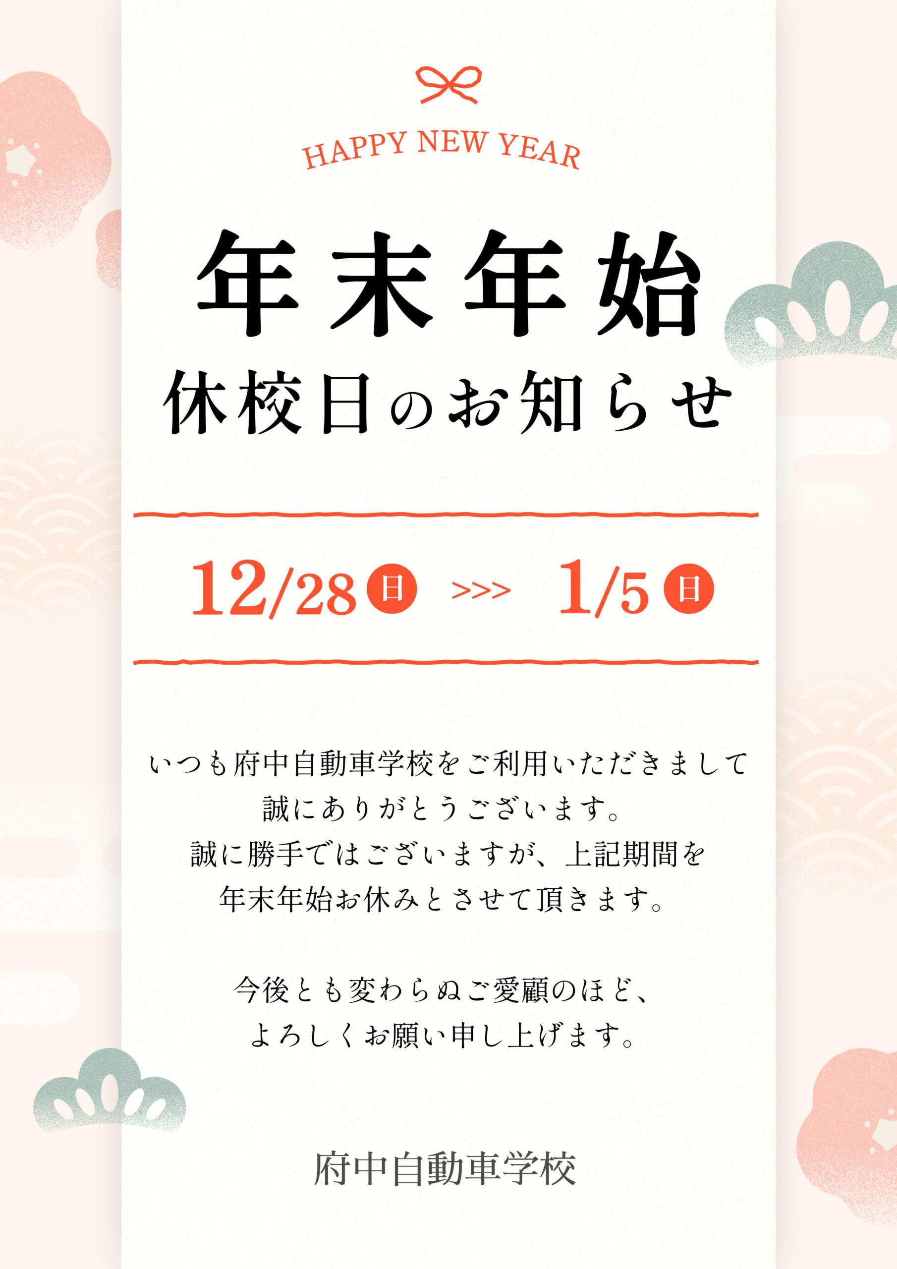 🎍年末年始の休校日のお知らせ🎍 fds_nagata2025-12-21T19:51:56+09:002025.12.21|お知らせ, キャンペーン, トップバナー| 関連投稿 🎄期間限定🎅クリスマスクーポン5,000円🈹🎄 2025.12.01 🚗休校日のお知らせ🍁 2025.10.01 🍁秋の普通免許取得応援🚗!5,000円割引クーポン!! 2025.10.01 🍁秋の他車種免許取得応援🚚🚜🏍!3,000円割引クーポン !! 2025.10.01